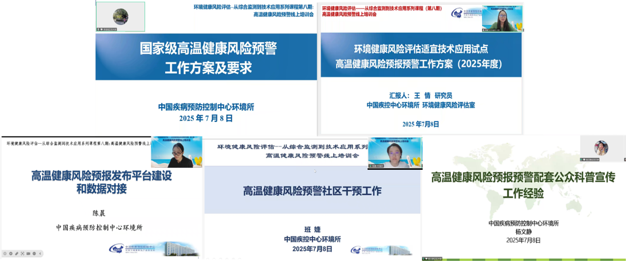 王情研究员、陈晨副研究员、班婕副研究员和杨文静副研究员分别针对环境健康风险评估适宜技术应用试点高温健康风险预警工作总体方案、高温健康风险预报发布平台建设和数据对接、高温健康风险预警社区干预、以及高温健康风险预报预警配套公众科普宣传等内容进行专题培训。