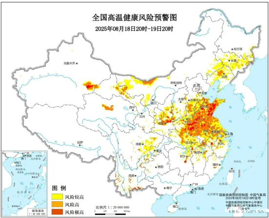 预计,8月18日20时至19日20时,华北南部、东北地区中南部、黄淮、江淮、江汉东部、江南北部、西南地区东部和南部、西北地区中部和东部、内蒙古西部、新疆东部高温健康风险较高(黄色预警);山东、江苏、河南、安徽、上海、浙江、湖北、河北、陕西、山西、甘肃、辽宁、湖南、江西、福建、云南、青海、内蒙古、新疆等地的部分地区高温健康风险高(橙色预警),其中,山东中东部和南部、河南东部、安徽北部和南部、陕西中部、湖北东南部、湖南中东部、福建中部、新疆东部、云南南部等地的部分地区高温健康风险极高(红色预警)。请公众及时关注预警信息变化,保持室内凉爽,避开高温时段外出,减少户外活动,保证充足饮水。老人、孕妇、儿童、慢性病患者加强关注自身健康状况,如不适及时就医。户外作业者注意防暑降温。