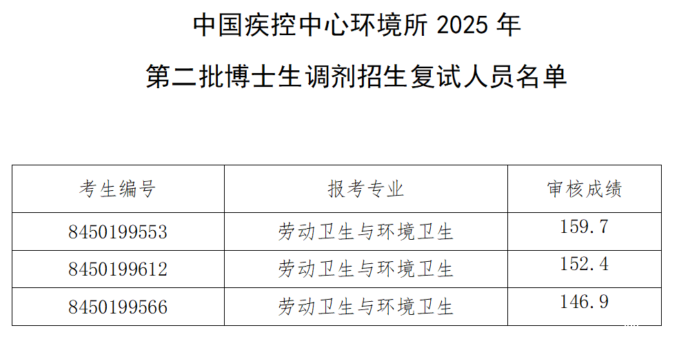 中国疾控中心环境所2025年第二批博士生调剂招生复试人员名单